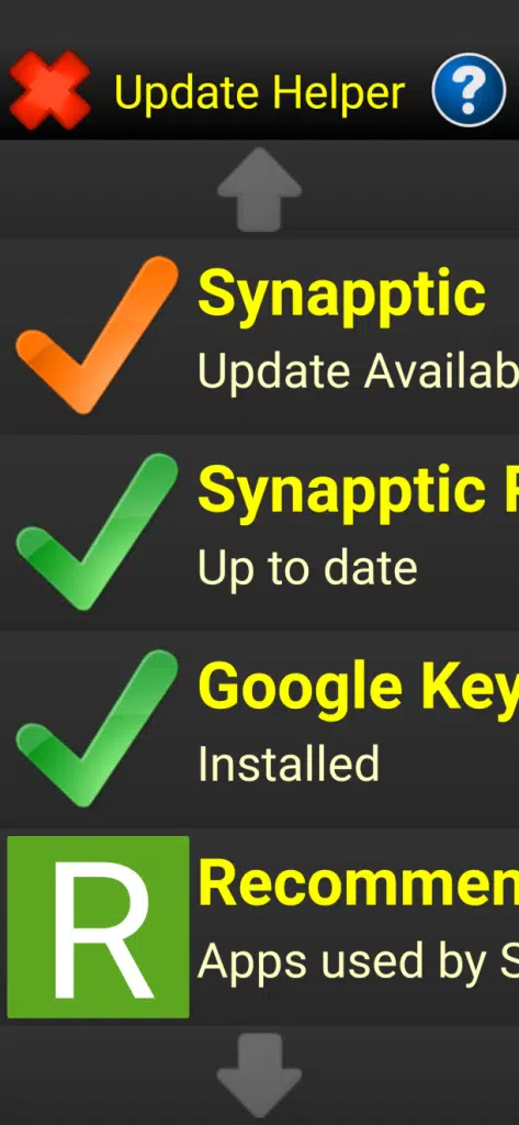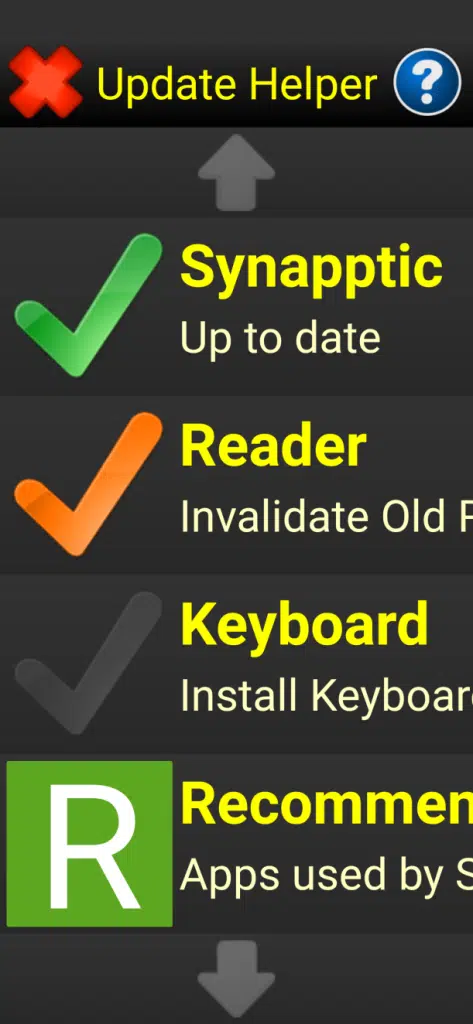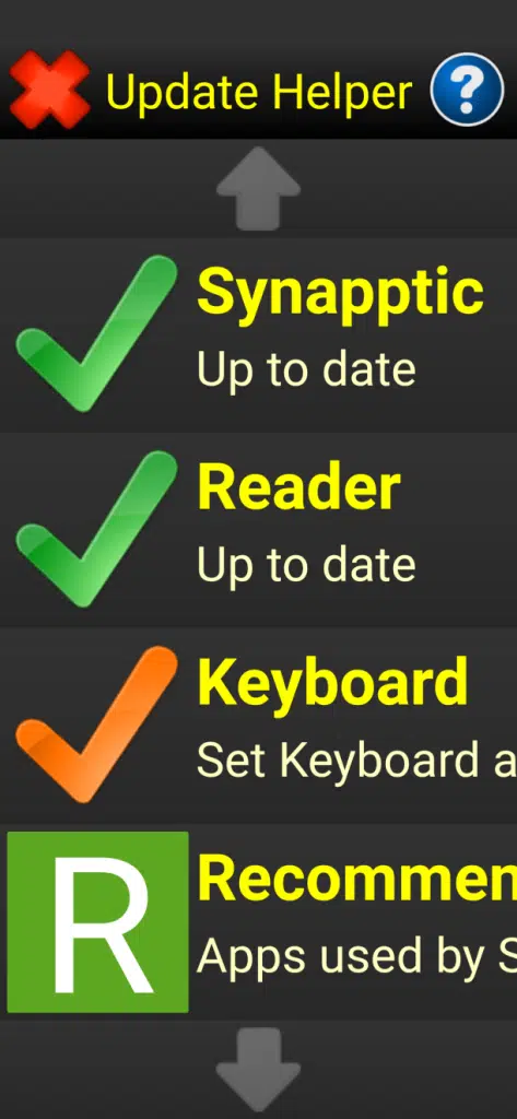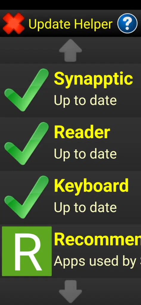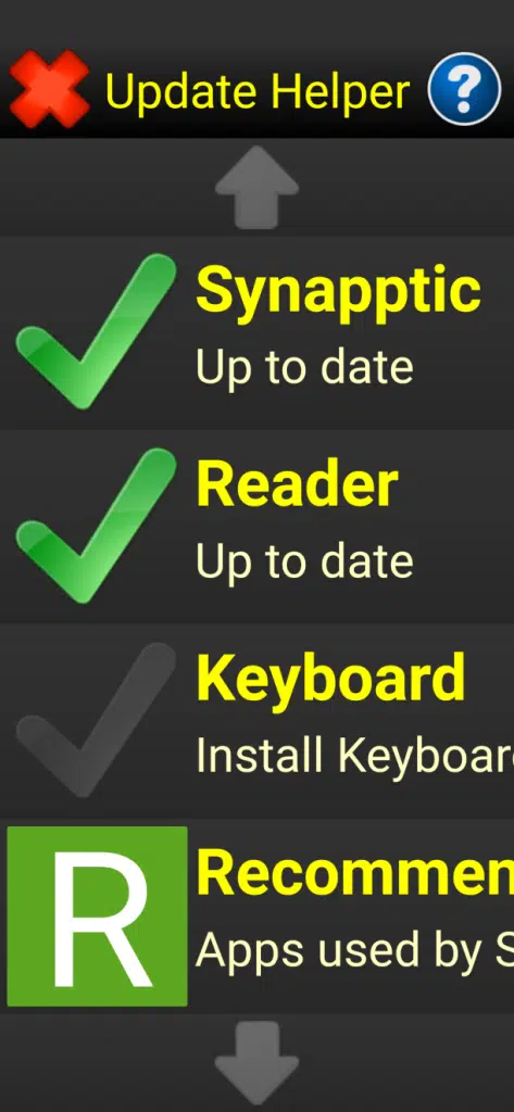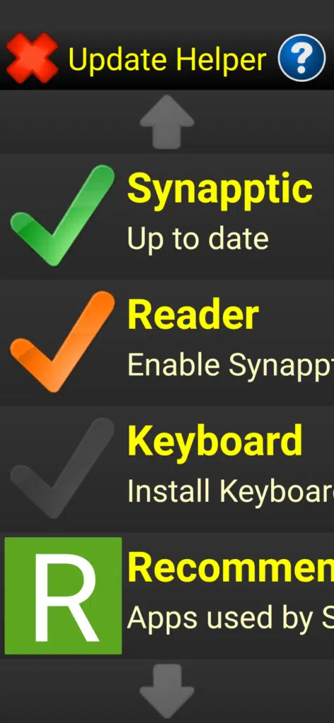 The Update Helper screen will show again. Synapptic, Synapptic Reader and the Keyboard option should now all be up to date and have green ticks.