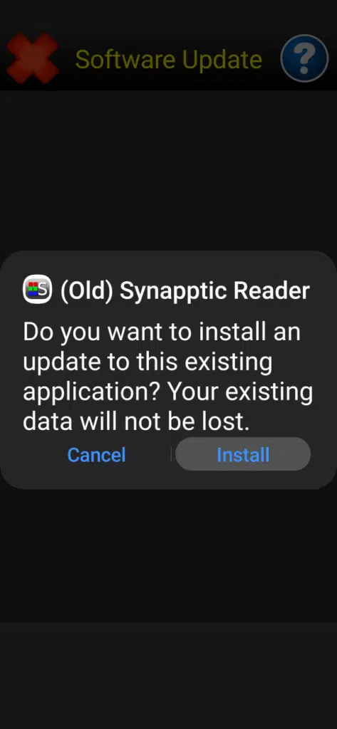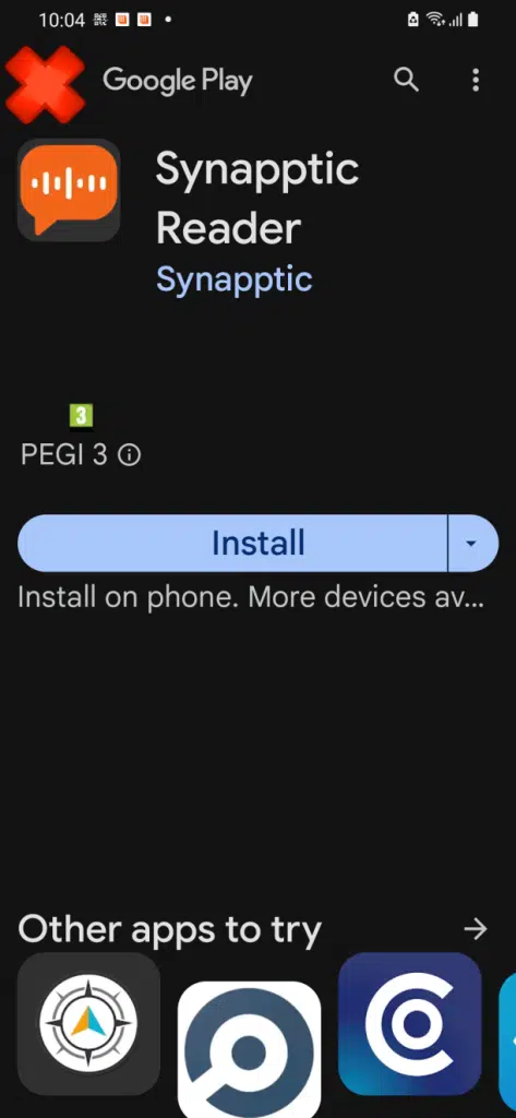 The Google Play store app will open at the download page for Synapptic Reader. Press the Install button and wait for the installation to complete. Synapptic will return to the Update Helper.