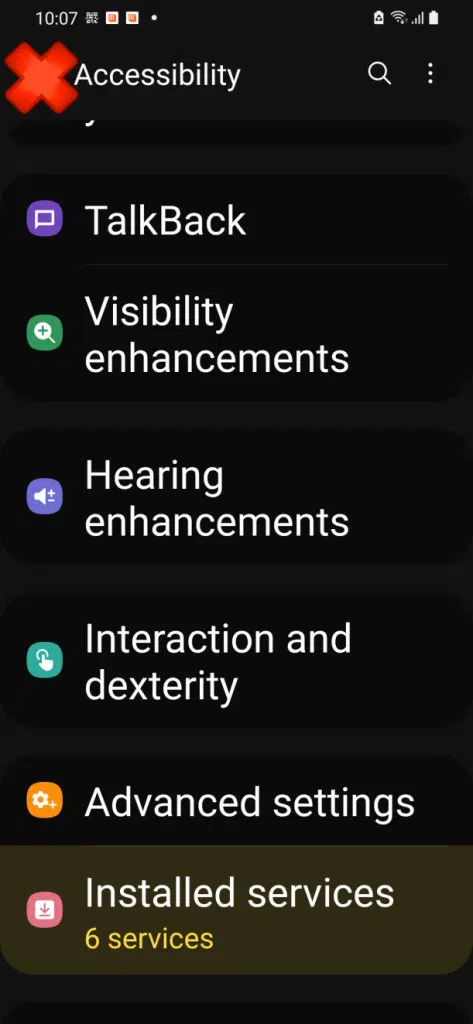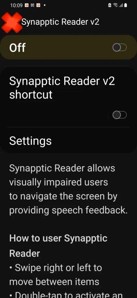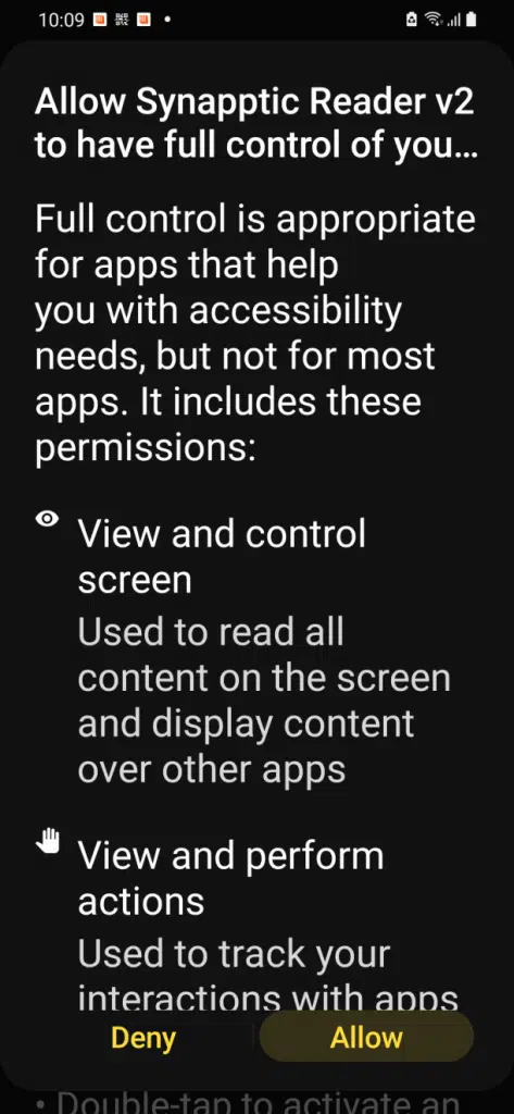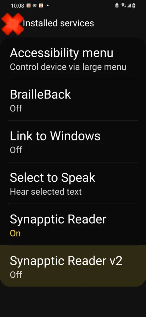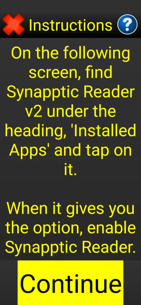 Select the Reader option again to Enable Synapptic Reader. Press the Continue option on the instructions screen and Synapptic will open the Android Accessibility Settings screen. Find the Installed Services or Installed Apps option and select it. Then select the Synapptic Reader V2 option.