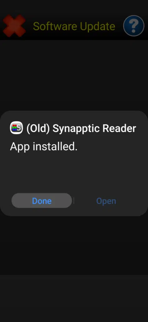 Press the Install and Done buttons, then press the Continue button to proceed. Synapptic Reader will now show in the Update Helper screen with a green tick and the title “up to date”.