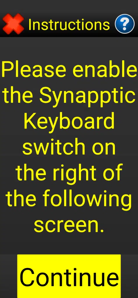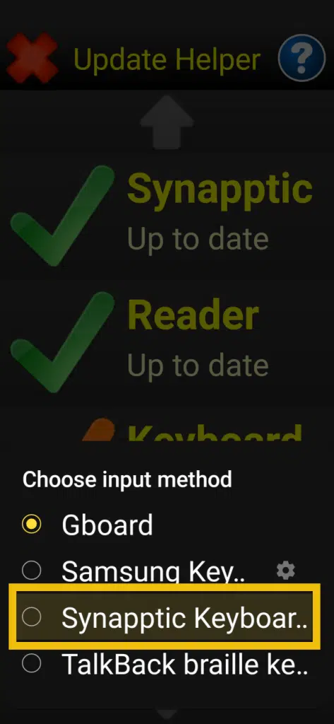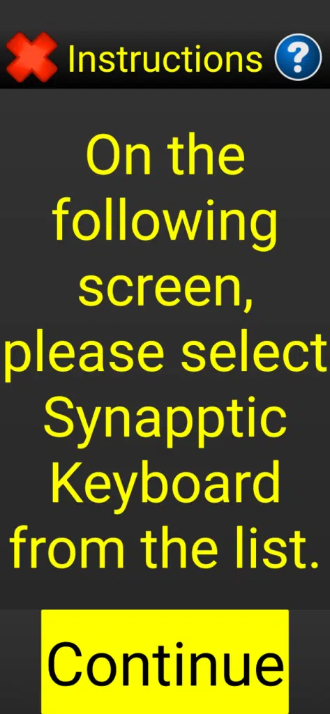 Select the Keyboard option from the Update Helper again, then press the Continue button on the Instructions screen. Android will show a list of available keyboards. Select the Synapptic Keyboard from the list.