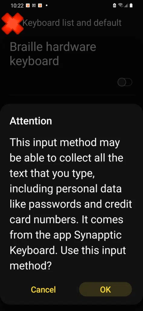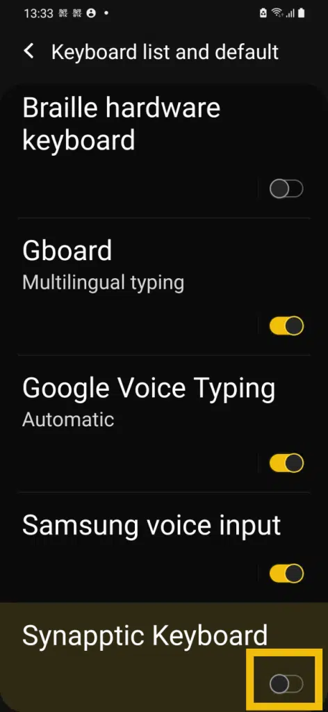 Select the Keyboard option in the Update Helper again, then press the Continue button. The list of available Android keyboards will display. Find the Synapptic Keyboard, then toggle the switch next to it. Note: You have to tap the little switch. If you tap on the text and not the little switch, you will receive an error message about failing to open settings for the Synapptic Keyboard.